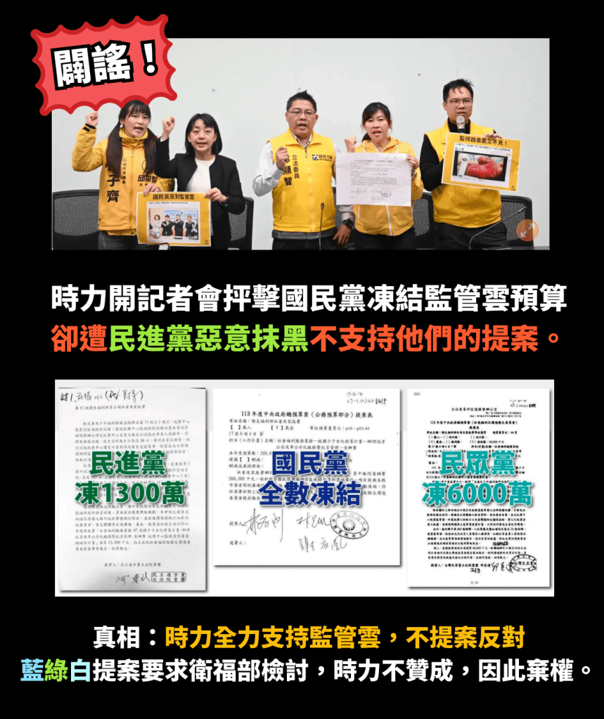 時力過去多次召開記者會推動幼托相關修法,更明確呼籲監視器畫面應上傳雲端備份,針對衛福部 2024 年編列的監管雲 2.6 億元預算,只有時力黨團力挺到底,所以才沒有提出任何預算凍結及刪減。