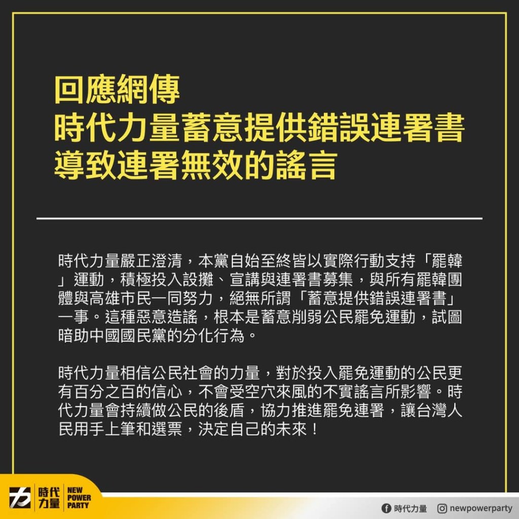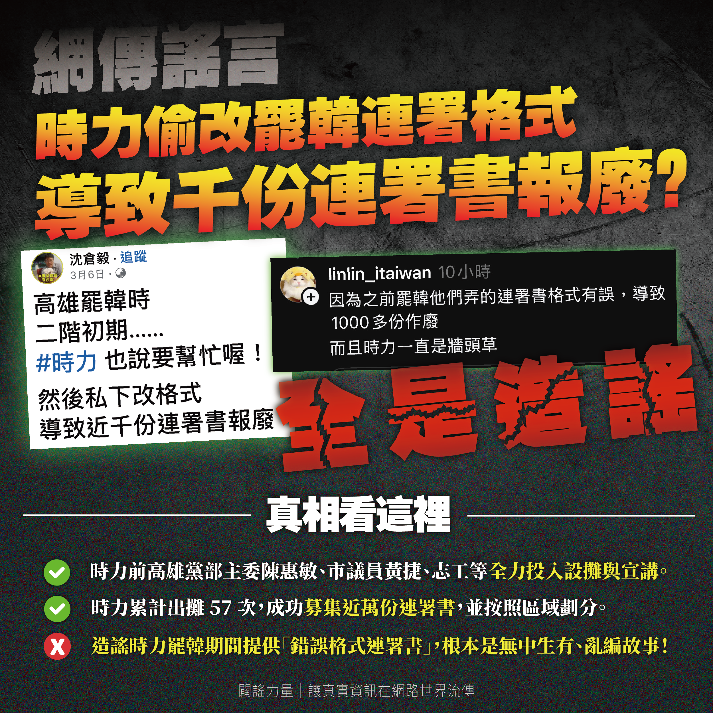 經查證,時力時任高雄黨部主委陳惠敏、市議員林于凱、市議員黃捷等皆積極投入罷韓,累計出攤 57 次且成功募集近萬份連署書,繳交給時任罷韓總部代表尹立,更獲頒贈「功在高雄」小匾額。