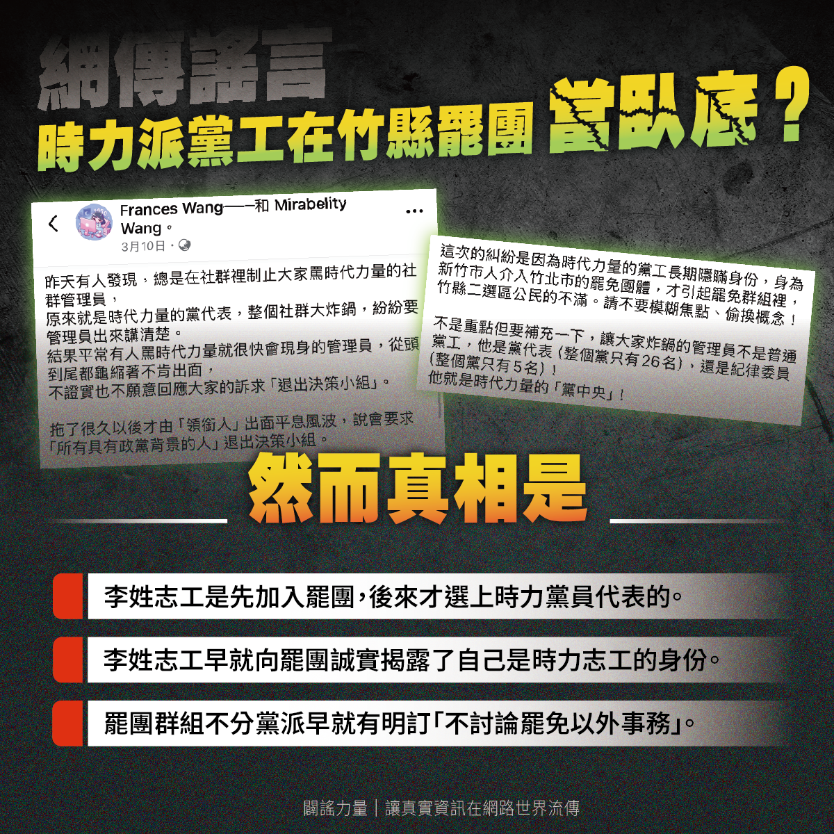 有關李慕哲是否刻意隱瞞身份,其實他是先加入罷團,才選上時力黨代表的。也可以參考撕銘團隊其他志工的說法(如圖),Frances Wang 爆料文章的留言也有人附上影片為證,李早就向罷團誠實揭露了時力相關身份。